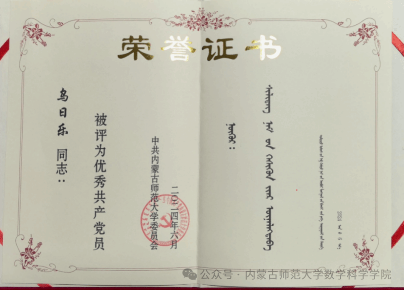 乌日乐,男,蒙古族,中共党员,qy球友会2024级博士研究生,专注于数学与人工智能交叉领域的研究,现任qy球友会博士研究生党支部组织委员。在校期间,他始终以“德才兼备、全面发展”为准则,在思想淬炼、学术科研、竞赛实践、志愿服务等方面表现突出,充分展现了新时代青年党员与研究生的责任担当和昂扬向上的精神风貌。2025年10月荣获全区高校党建“双创”研究生党员标兵荣誉称号。