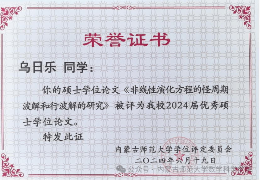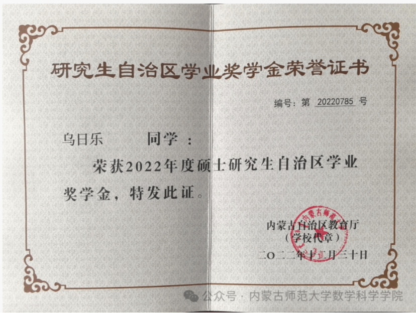 在深耕科研的同时,乌日乐注重理论与实践融合,主动投身高水平学科竞赛,以赛促学、以赛提能。先后获得第十届“数维杯”国际大员工数学建模挑战赛一等奖、第七届“华教杯”全国大员工数学竞赛(数学类专业组)初赛二等奖,展现出扎实的学科素养和创新能力。