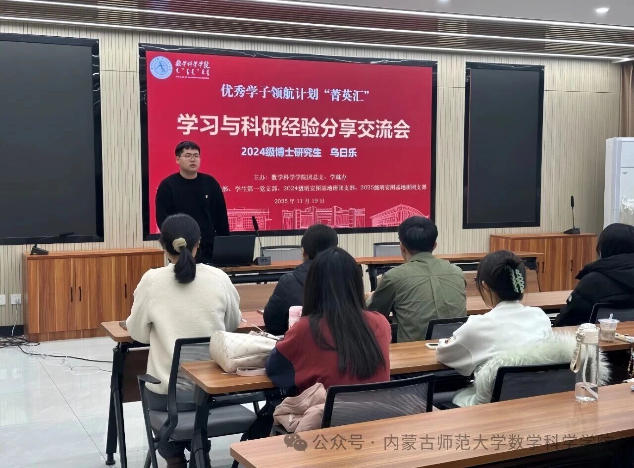 为发挥先进典型的示范引领作用,推动党建带团建有效落实,博士生党支部联合员工第一党支部、明安图基地班团支部启动“优秀学子领航计划”,由“全区高校研究生党员标兵”、2024级博士研究生、博士研究生党支部组织委员乌日乐分享了科研与学习经验,并与在座的同学们进行了交流。