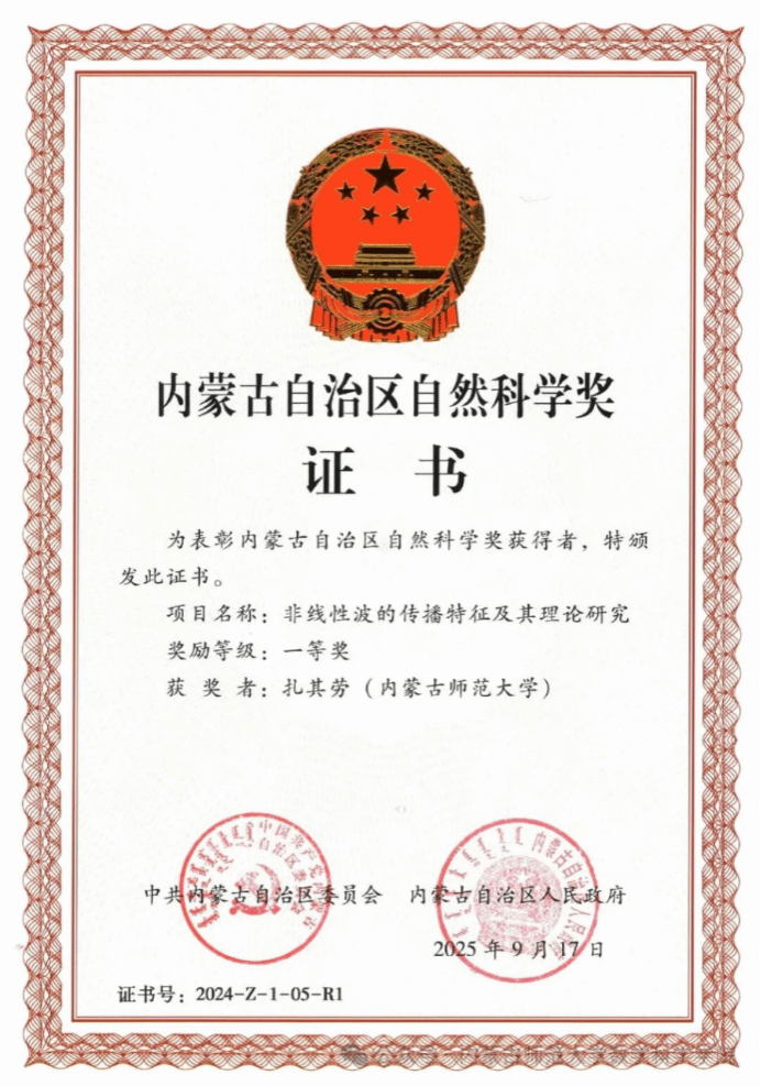 近日,内蒙古自治区科学技术奖励大会在呼和浩特市隆重召开。大会表彰了为全区科技进步和高质量发展作出突出贡献的科技工作者和科研团队。qy球友会院长扎其劳教授团队牵头的《非线性波的传播特征及其理论研究》荣获2024年度自治区自然科学奖一等奖。